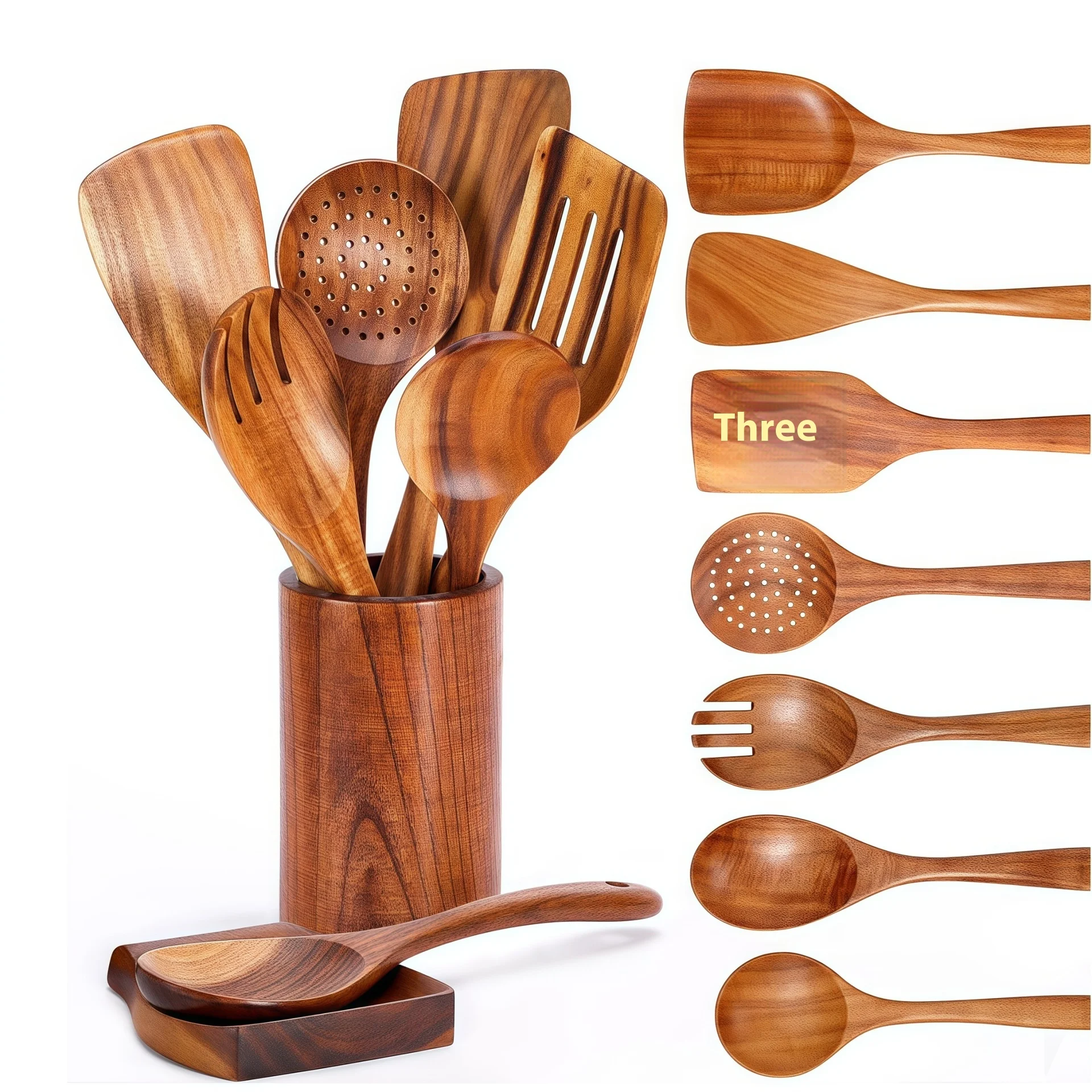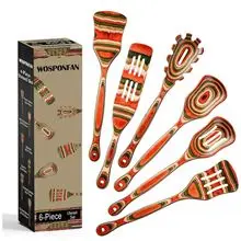 طقم أدوات مطبخ من خشب الأكاسيا مكوّن من ٩ قطع: ملعقة شوي مقاومة لدرجات الحرارة العالية، ملعقة سلطة، ملعقة حساء، ملعقة نودلز، وأدوات أخرى للمطبخ