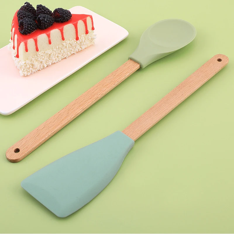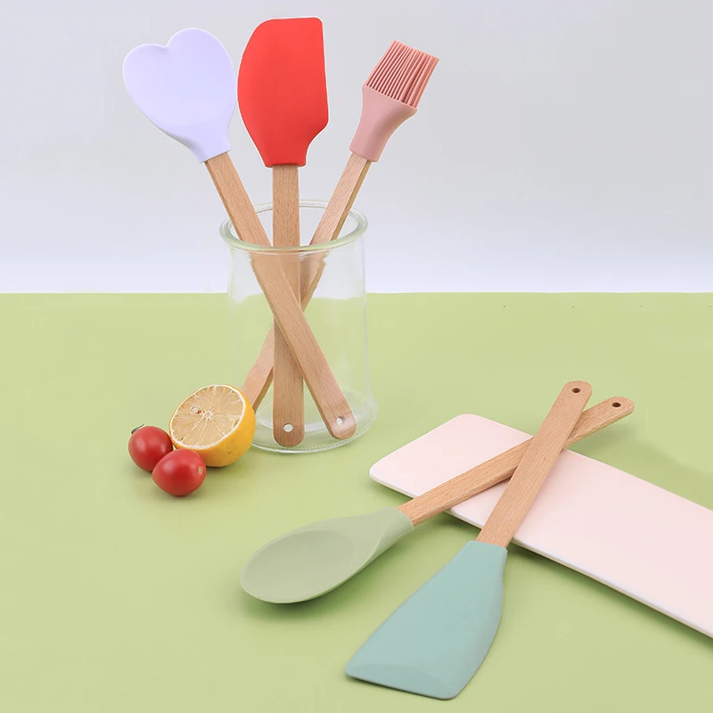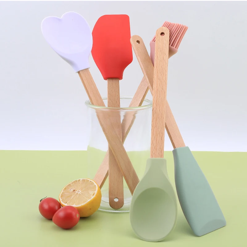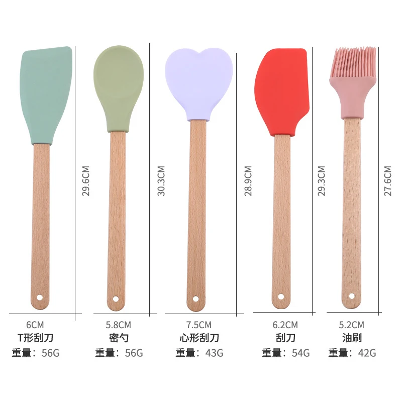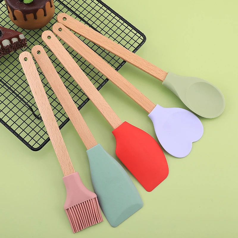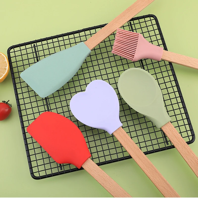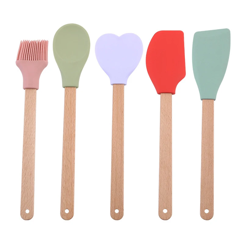 Lot de 5 spatules en silicone personnalisées, ustensiles de cuisine, spatules, pelles, cuillères et brosses à huile avec manche en bois