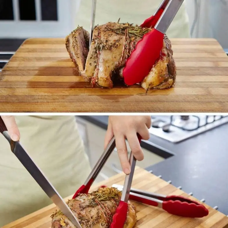 The silicone tip design offers superior gripping capabilities compared to traditional metal-only tongs, providing secure handling of various food textures and shapes. This enhanced control reduces the risk of dropping food items during transfer operations, improving kitchen efficiency and minimizing waste. The soft silicone surface also prevents scratching of non-stick cookware and delicate serving dishes, extending the lifespan of kitchen equipment investments.